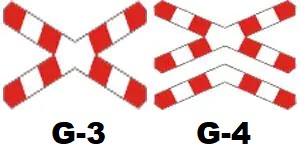 Przejazdy kolejowe dzieli się na przejazdy jedno i wielotorowe oznakowane specjalnymi znakami tj. krzyżem św. Andrzeja G3 i G4. Znaki te wyznaczają miejsce zatrzymania się w związku z ruchem pociągu lub innego pojazdu szynowego na przejeździe kolejowym bez zapór lub pół zapór. Znaki te informują, że na przejeździe występują odpowiednio jeden lub więcej torów.